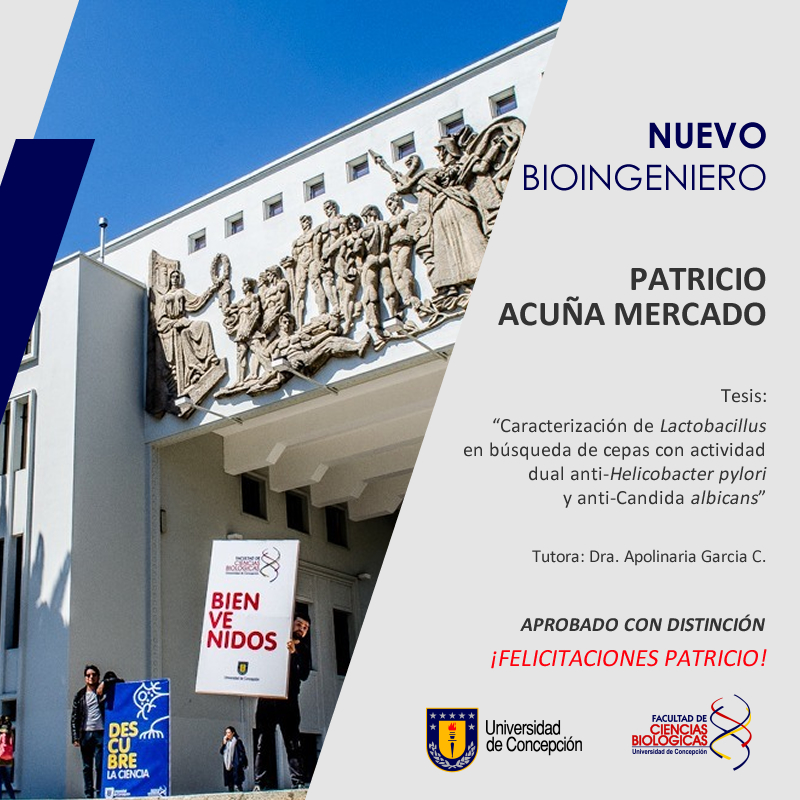 Esta mañana defendió y aprobó con distinción su tesis «Caracterización de Lactobacillus en búsqueda de cepas con actividad dual anti-Helicobacter pylori y anti-Candida albicans«, el alumno y nuevo Bioingeniero Patricio […]