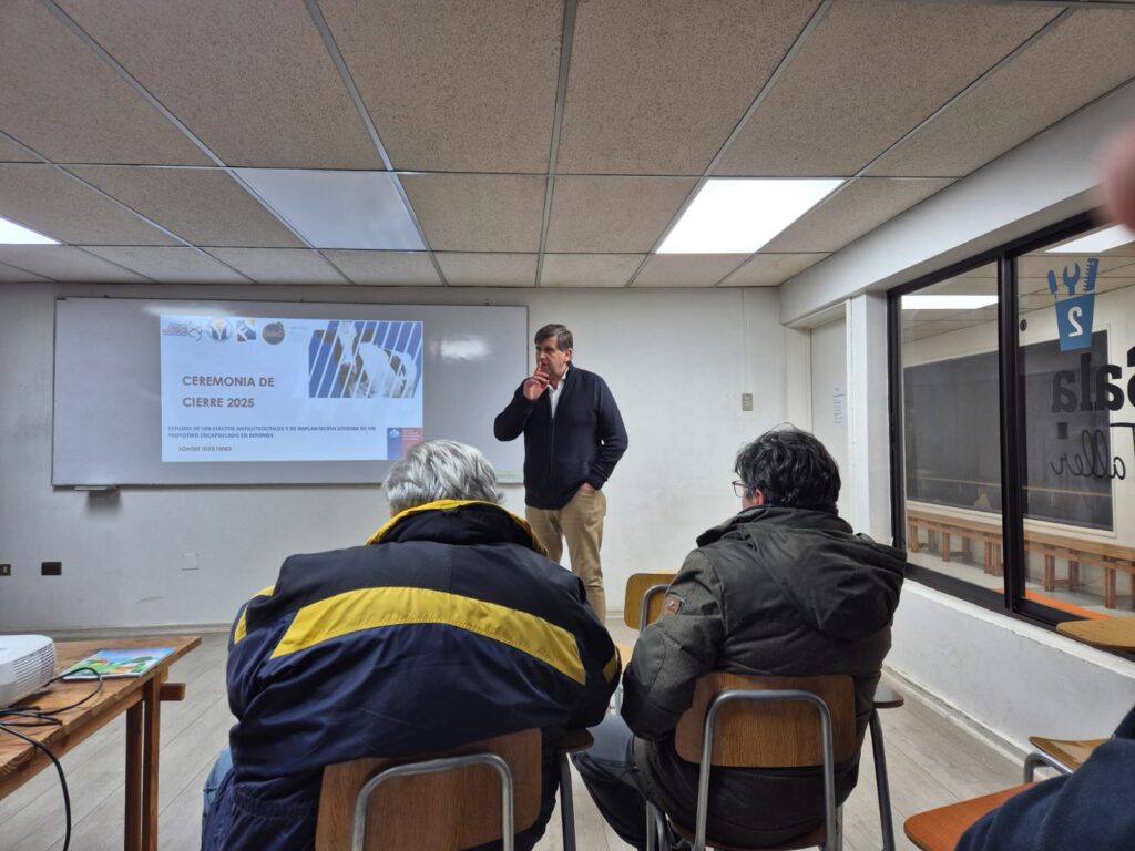El académico del Departamento de Fisiopatología de la Facultad de Ciencias Biológicas de la Universidad de Concepción, Dr. Emilio Lamazares, realizó la ceremonia de cierre del proyecto FONDEF ID23I10082, titulado “Estudio de los efectos antiluteolíticos y de implantación uterina de un prototipo encapsulado en bovinos”.