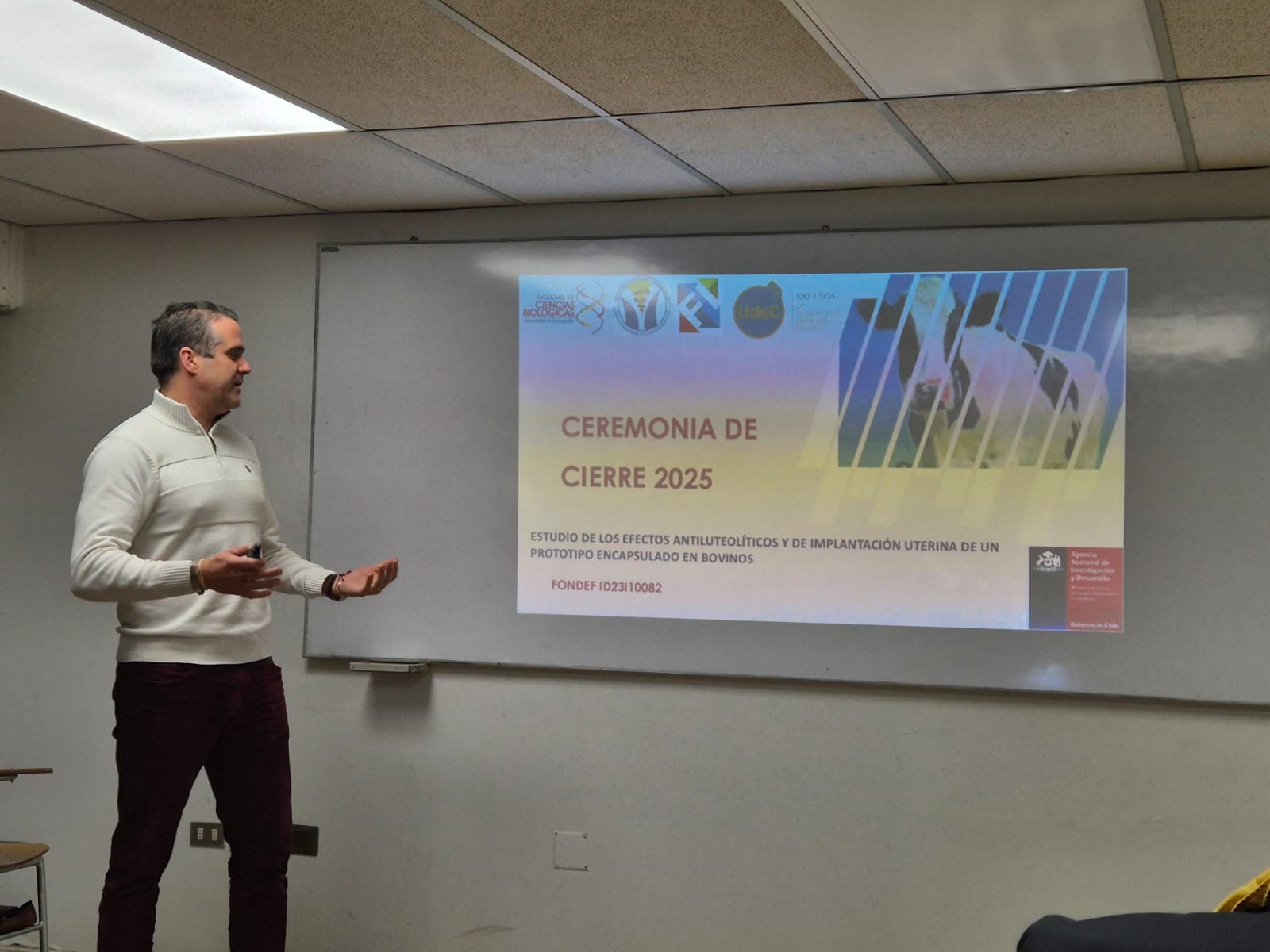 El académico del Departamento de Fisiopatología de la Facultad de Ciencias Biológicas de la Universidad de Concepción, Dr. Emilio Lamazares, realizó la ceremonia de cierre del proyecto FONDEF ID23I10082, titulado “Estudio de los efectos antiluteolíticos y de implantación uterina de un prototipo encapsulado en bovinos”.