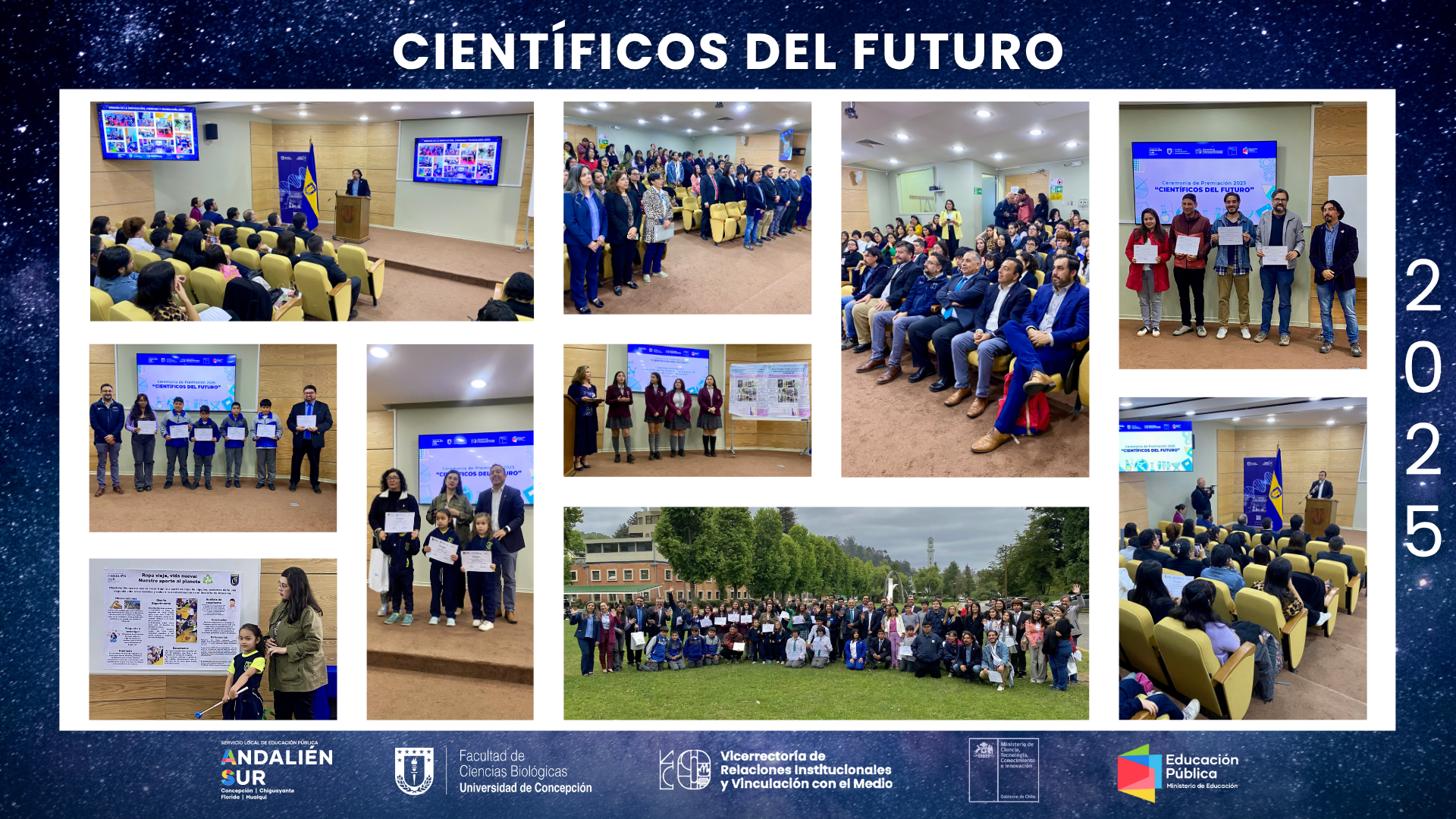 Por cuarto año consecutivo se realizó la ceremonia de premiación del concurso Científicos del Futuro en la UdeC, instancia que reconoce los proyectos desarrollados por niñas, niños y jóvenes estudiantes de los establecimientos del SLEP Andalién Sur, guiados por tutores de la centenaria casa de estudios, entre ellos, académicos, estudiantes e investigadores; cuyos resultados fueron presentados durante la VI Muestra Escolar ICyT.