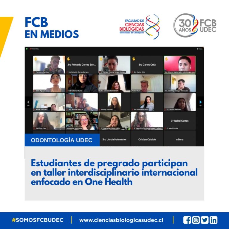 Conectados sincrónicamente con estudiantes de veterinaria de la Universidad de Murcia (España) las y los estudiantes de tercer año que cursan la asignatura Farmacología para Odontología, participaron del seminario “Proyecto One Health: Un abordaje interdisciplinario de las enfermedades emergentes”, liderado por la académica del Departamento de Farmacología de la FCB-UdeC, Dra. Jacqueline Sepúlveda Carreño. Conoce más de esta noticia aquí: http://odontologia.udec.cl/?p=4387