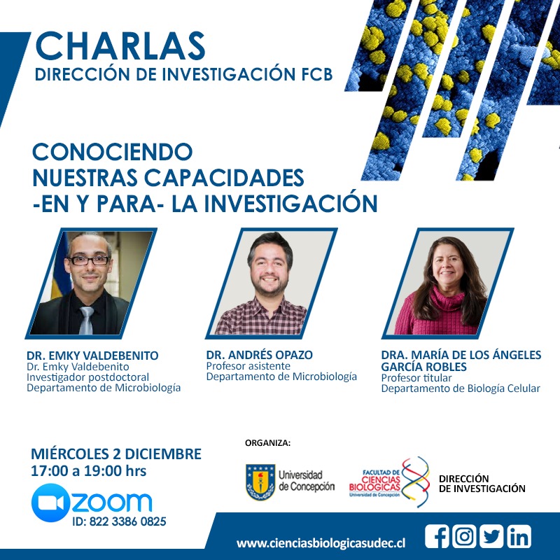 Los y las invitamos a participar de la cuarta sesión del Ciclo de Charlas «Conociendo Nuestras capacidades -en y para- la investigación» En esta oportunidad estará junto a nosotros la Dra. María de los Ángeles García, Dr. Andrés Opazo y el Dr. Emky Valdebenito.