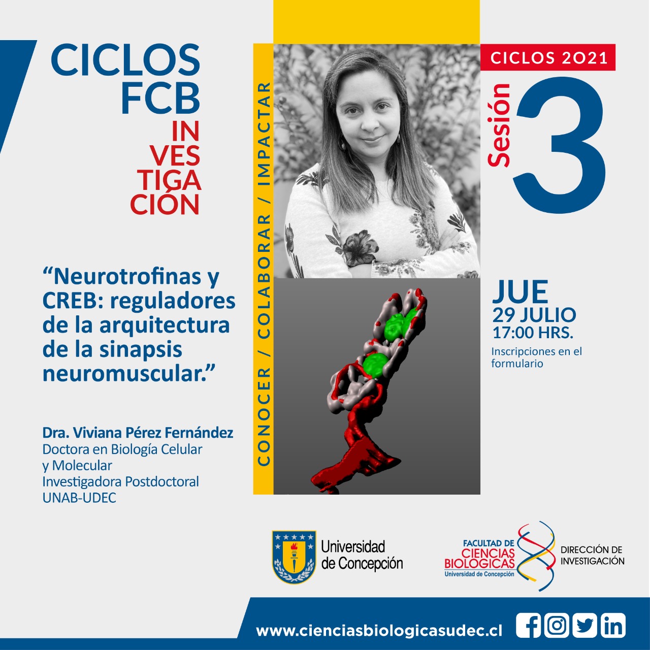 Atención #comunidadFCB porque nuestro Ciclo de Charlas Investigación FCB 2021 continúa este jueves 29 de julio a las 17H. En esta oportunidad la Dra. Viviana Pérez conversará con nosotros sobre las #neurotrofinas y #CREB, los reguladores de la arquitectura de la sinapsis neuromuscular