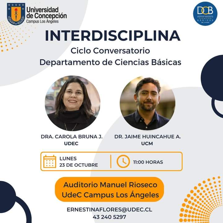 La profesora del Departamento de Bioquímica y Biología Molecular, doctora Carola Bruna, participará del Ciclo de Conversatorios del Departamento de Ciencias Básicas de la Escuela de Educación del campus Los Ángeles. Tema Interdisciplina.