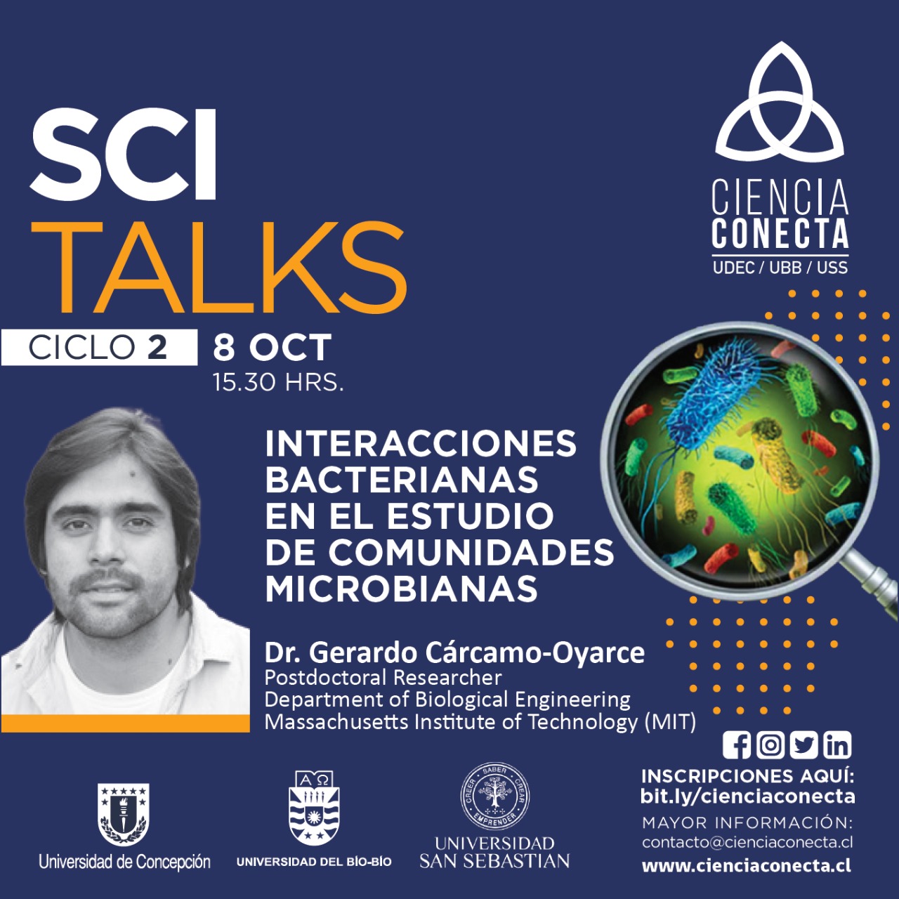 La actividad inaugural estará a cargo del investigador postdoctoral del Departamento de Ingeniería Biológica del Massachusetts Institute of Technology (MIT), Dr. Gerardo Cárcamo-Oyarce, con una charla titulada como «Interacciones bacterianas en el estudio de comunidades bacterianas”.