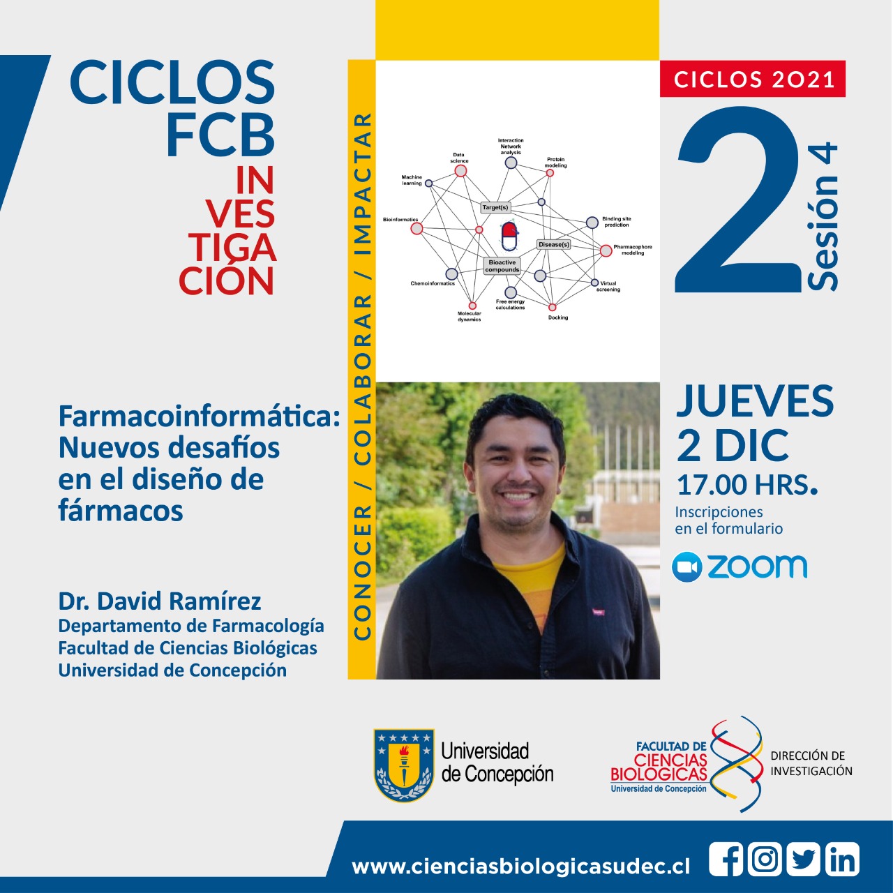 #ComunidadFCB Durante el tercer día del cuadragésimo segundo congreso anual de la Sociedad de Farmacología de Chile (1 al 3 de diciembre), participará como coordinador y expositor del simposio «Polifarmacología y diseño de fármacos multidiana: Nuevas oportunidades en farmacología”, el docente del departamento de Farmacología Dr. David Ramírez.