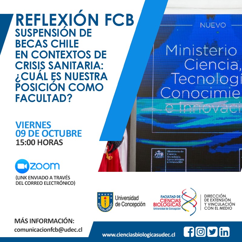 Como Dirección Extensión y Vinculación con el Medio FCB, creemos que la Suspensión de Becas Chile por parte del Ministerio de Ciencia, Tecnología, Conocimiento e Innovación, es un hito que se relaciona de manera directa e indirecta con en el quehacer de nuestra facultad y, por lo tanto, es necesario desarrollar un espacio de dialogo con el propósito de conocer cuales son nuestras posturas, opiniones y críticas al respecto y así, en el mejor de los casos, desarrollar una postura oficial como organización, considerando que somos una facultad que tiene como objetivo el desarrollo científico y tecnológico y, la formación de nuevos profesionales en el área de las ciencias biológicas en el país.