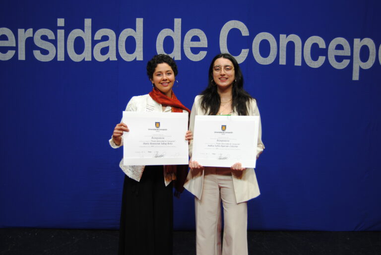 Las ex estudiantes de la carrera de Bioingeniería, Andrea Oyarzún Cisterna y María Monserrat Sabag Brito, recibieron el reconocimiento por su excelencia académica en la ceremonia de Premio Universidad de Concepción realizada en el teatro de la casa de estudios.