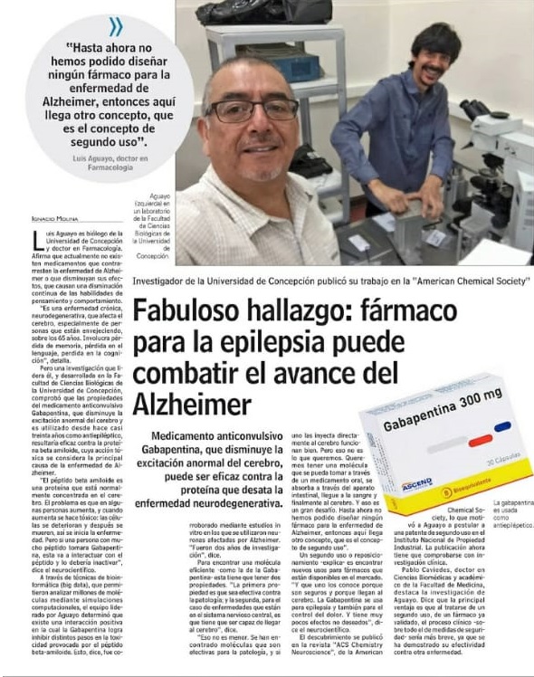 «Hasta ahora no hemos podido diseñar ningún fármaco para la enfermedad de Alzheimer, entonces aquí llega otro concepto, que es el concepto del segundo uso», señaló el Dr. Luis Aguayo, académico del Departamento de Fisiología de la Facultad de Ciencias Biológicas de la UdeC. El docente, quien lideró la investigación publicada recientemente por la revista ACS Chemistry Neuroscience, expuso que la Gabapentina actúa sobre la proteína beta amiloide, cuya acción tóxica se considera la principal causa de Alzheimer.