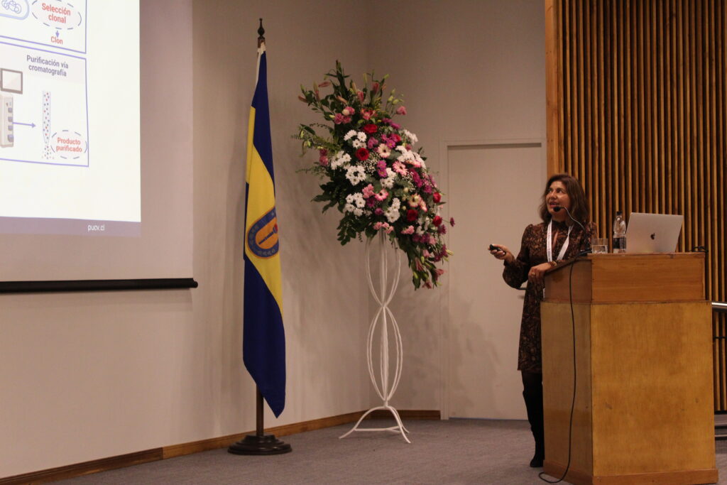 La encargada de cerrar las conferencias fue la Dra. Claudia Altamirano, ingeniera civil bioquímica de la Pontificia Universidad Católica de Valparaíso, que expuso sobre “Biofármacos: perspectiva desde la ingeniería de bioprocesos”.