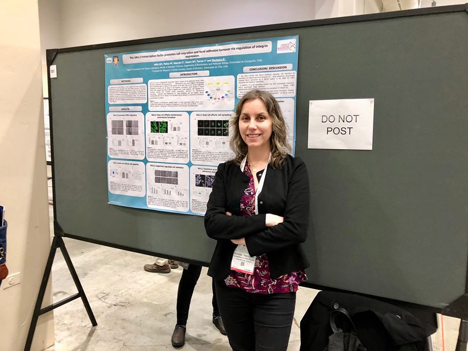 En la instancia, la académica presentó en modalidad poster el estudio realizado por miembros de su laboratorio titulado “The SALL2 transcription factor promotes cell migration and focal adhesion turnover via regulation of integrin expression” en el que participó como autora junto a Elizabeth Riffo, Mario Palma, Catalina Alarcón, Dr. Ariel Castro de la FCB y el Dr. Vicente Torres, colaborador y académico de la Universidad de Chile.