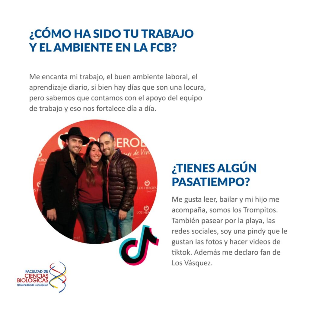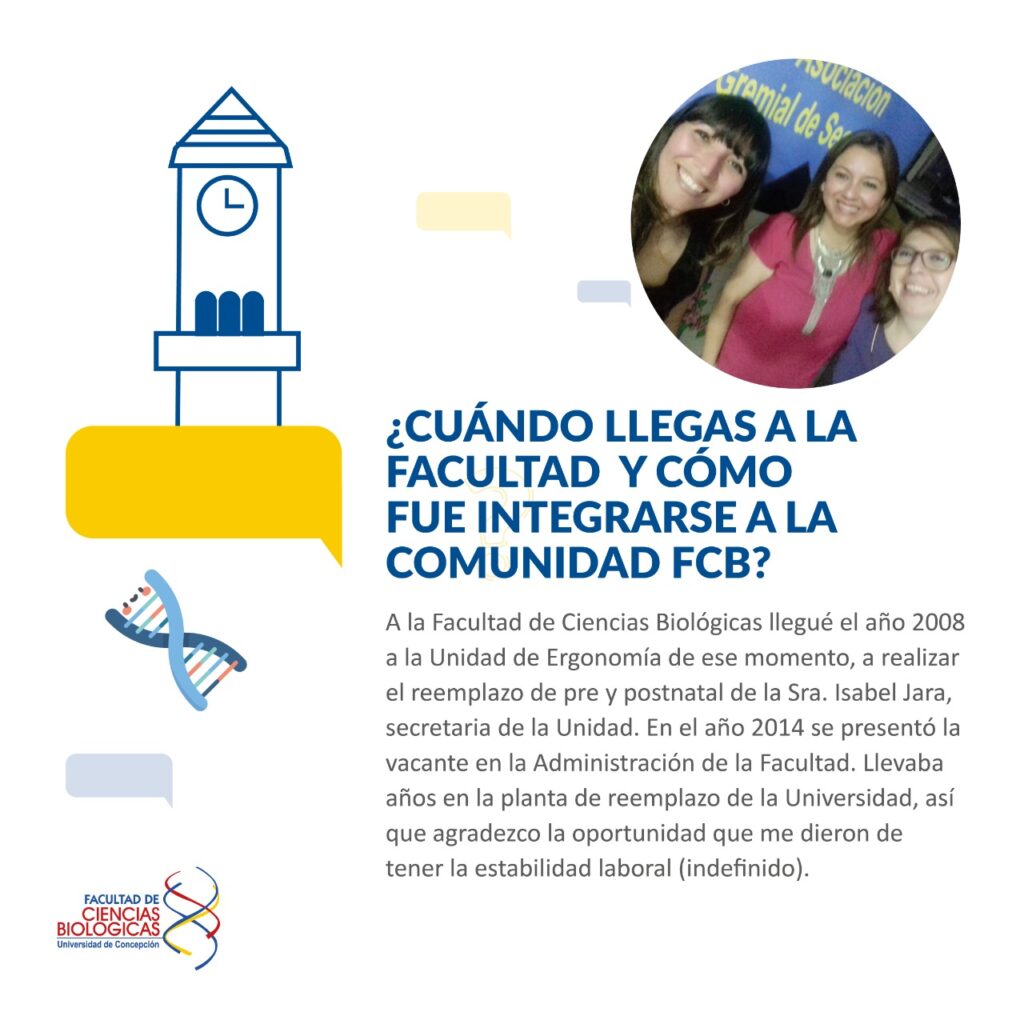 A la Facultad de Ciencias Biológicas llegué el año 2008 a la Unidad de Ergonomía de ese momento, a realizar el reemplazo de pre y postnatal de la Sra. Isabel Jara, secretaria de la Unidad. En el año 2014 se presentó la vacante en la Administración de la Facultad. Llevaba años en la planta de reemplazo de la Universidad, así que agradezco la oportunidad que me dieron de tener la estabilidad laboral (indefinido).