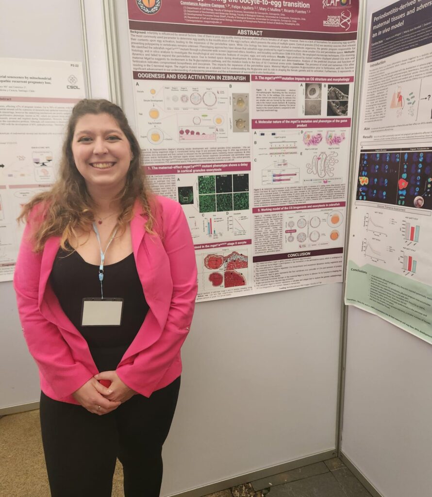 Constanza Aguirre, bioingeniera y asistente de investigación en el Departamento de Biología Celular, presentó un póster que resumía sus tesis de pregrado. Esta tesis se centra en una mutación que posee la hembra en el modelo de pez cebra y como esta afecta la descendencia y el desarrollo embrionario.