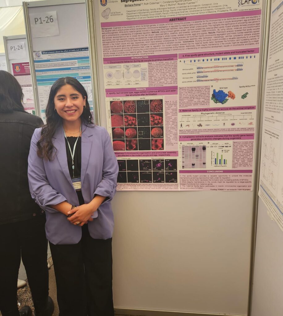 Bárbara Palma, estudiante de Bioingeniería UdeC, presentó un póster con los avances de la tesis que está desarrollando. Su investigación se centra en un mutante de efecto materno denominado “Spotty”. Este mutante presenta defectos posterior a la fertilización, impidiendo que pueda progresar la embriogénesis.