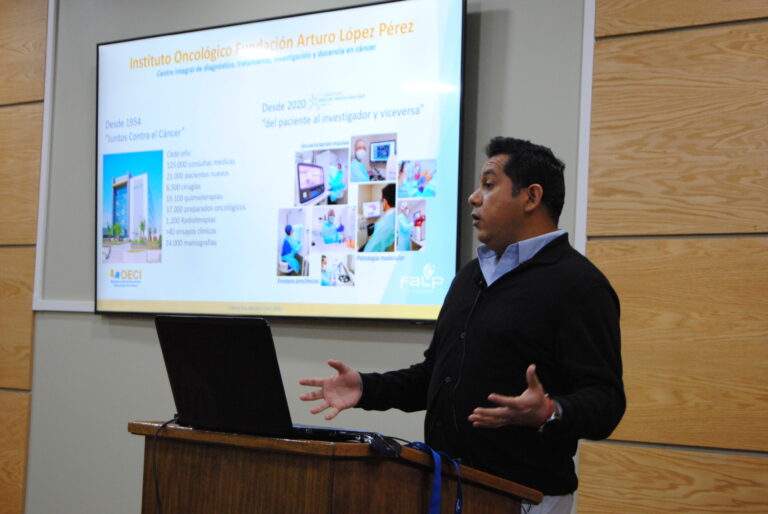 - La presentación fue realizada por el Dr. Franz Villarroel Espíndola, jefe del Laboratorio de Medicina Traslacional de la fundación Arturo López Pérez, quien en su exposición enfatizó en la necesidad de revisar aspectos traslacionales de cómo se entienden las células tumorales en la biología del tumor.