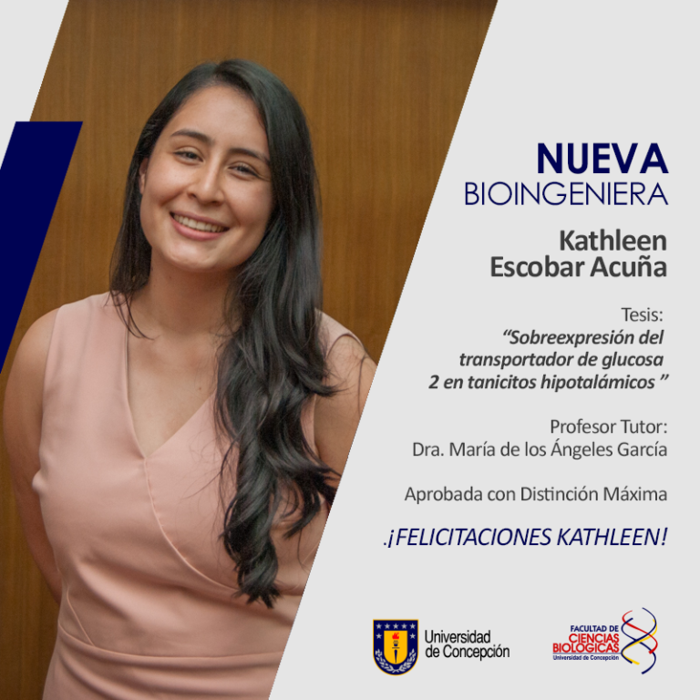 Felicitamos a la nueva Bioingeniera de nuestra casa de estudios, Kathleen Escobar Acuña, quien aprobó su tesis «Sobreexpresión del Transportador de Glucosa 2 en Tanicitos Hipotalámicos». Que el inicio de esta nueva etapa esté repleta de logros!