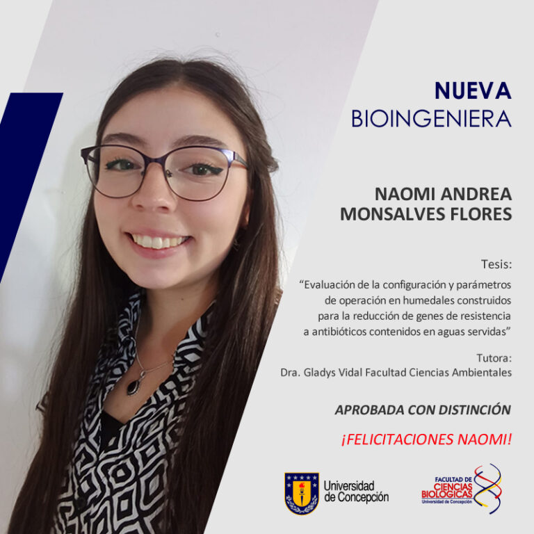 Felicitamos a nuestra nueva Bioingeniera, Naomi Andrea Monsalves Flores, quien ayer lunes 7 de marzo defendió y aprobó con distinción su tesis: «Evaluación de la configuración y parámetros de operación en humedales construidos para la reducción de genes de resistencia a antibióticos contenidos en aguas servidas».