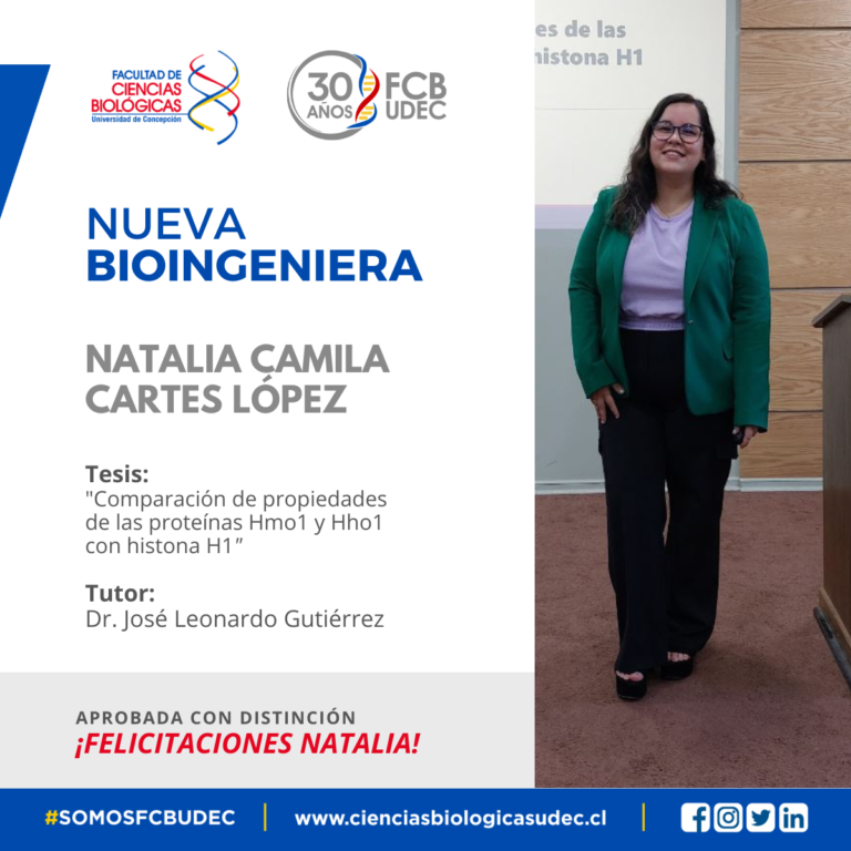 El día de ayer, defendió y aprobó con distinción su tesis: «Comparación de propiedades de las proteínas Hmo1 y Hho1 con histona H1» la señorita, y nueva bioingeniera, Natalia Camila Cartes López. Su tutor durante este proceso fue el Dr. José Leonardo Gutiérrez.