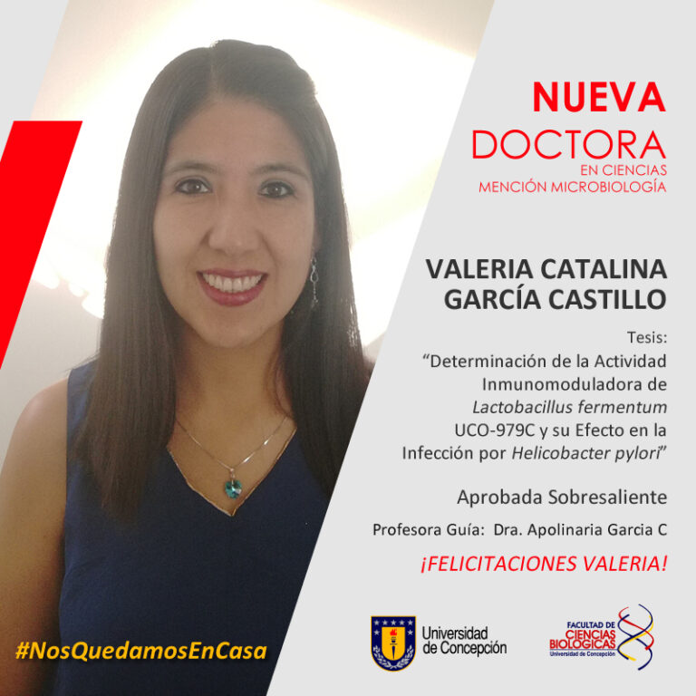 Felicitamos a nuestra nueva Doctora en Ciencias, Mención Microbiología, Valeria Catalina García Castillo, quien el pasado 17 de marzo obtuvo su grado al aprobar con concepto sobresaliente su tesis: «Determinación de la Actividad Inmunomoduladora de Lactobacillus fermentum UCO-979C y su Efecto en la Infección por Helicobacter pylori«.