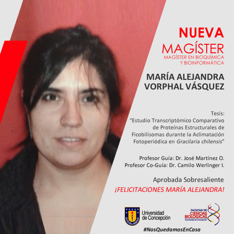 Saludamos a nuestra nueva Magíster en Bioquímica y Bioinformática, María Alejandra Vorphal Vásquez quien recientemente obtuvo su grado al defender con éxito su Tesis:“Estudio Transcriptómico Comparativo de Proteínas Estructurales de Ficobilisomas durante la Aclimatación Fotoperiódica en Gracilaria chilensis”.