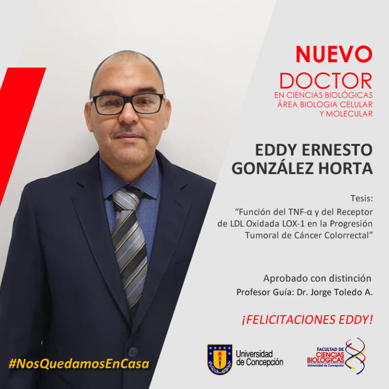 El pasado jueves 1 de abril, el Sr. Eddy Ernesto González Horta obtuvo su grado de Doctor en Ciencias, Área Biología Celular y Molecular, al defender y aprobar con distinción su tesis: «Función del TNF-α y del Receptor de LDL Oxidada LOX-1 en la Progresión Tumoral de Cáncer Colorrectal».