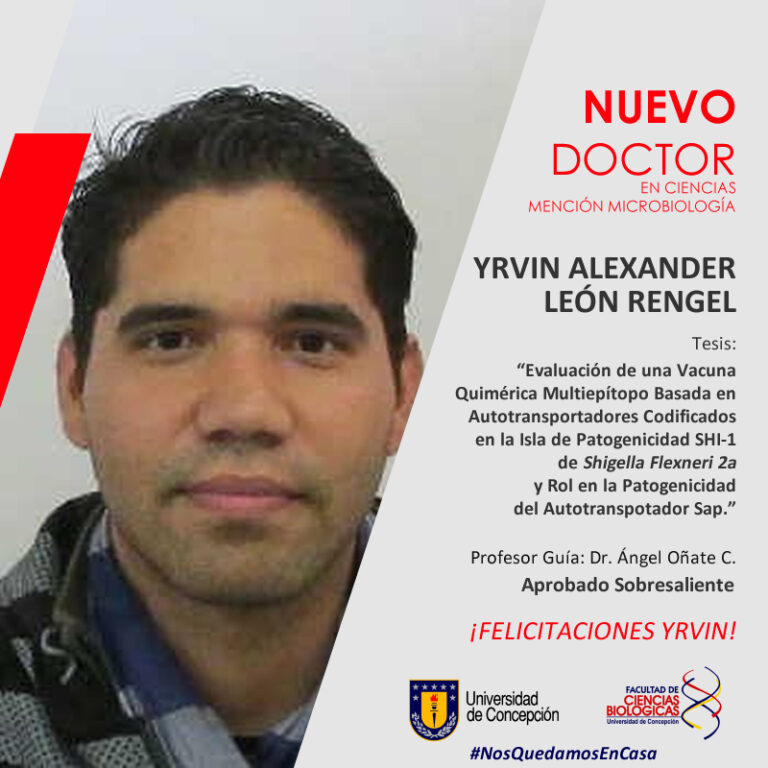 El pasado mes de octubre, aprobó con concepto de sobresaliente la defensa de su tesis: «Evaluación de una Vacuna Quimérica Multiepítopo Basada en Autotransportadores Codificados en la Isla de Patogenicidad SHI-1 de Shigella Flexneri 2a y Rol en la Patogenicidad del Autotranspotador Sap.», Yrvin Alexander León Rengel, obteniendo así su grado de Doctor en Ciencias, Mención Microbiología. Su guía fue el Dr. Angel Oñate C.