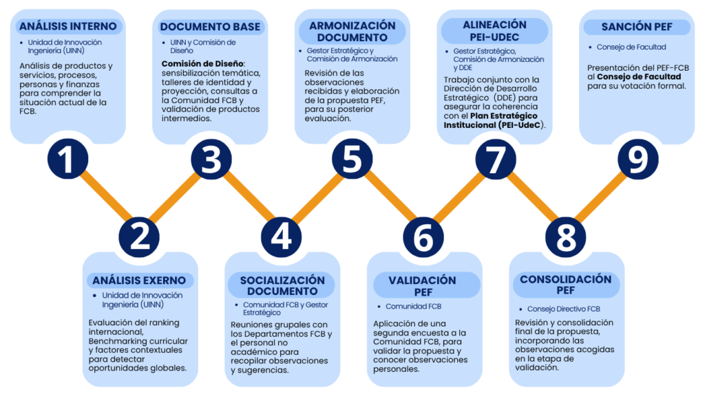 La propuesta de PEF-FCB alinea nuestras acciones con la hoja de ruta institucional UdeC. Esto, permite potenciar nuestra coherencia académica y estratégica, para lo cual hemos contado con el apoyo técnico de la Dirección de Desarrollo Estratégico (DDE).