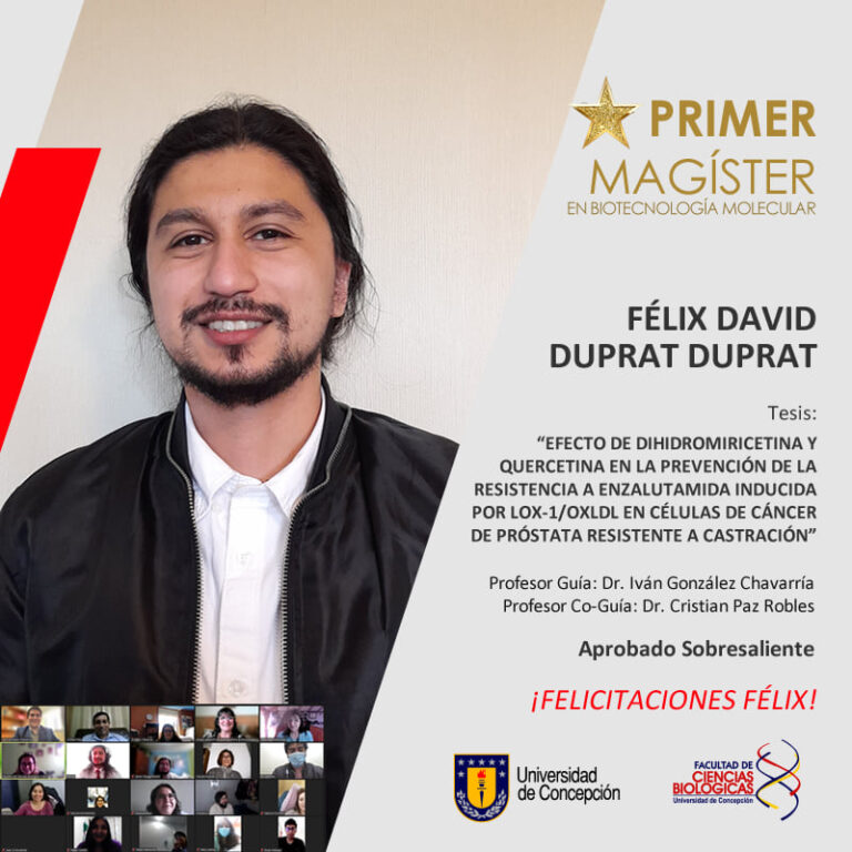 La mañana del martes 7 de Diciembre Félix Duprat Duprat defendió y aprobó con «sobresaliente» su Examen de Grado, convirtiéndose así en el primer egresado del programa de Magíster en Biotecnología Molecular.
