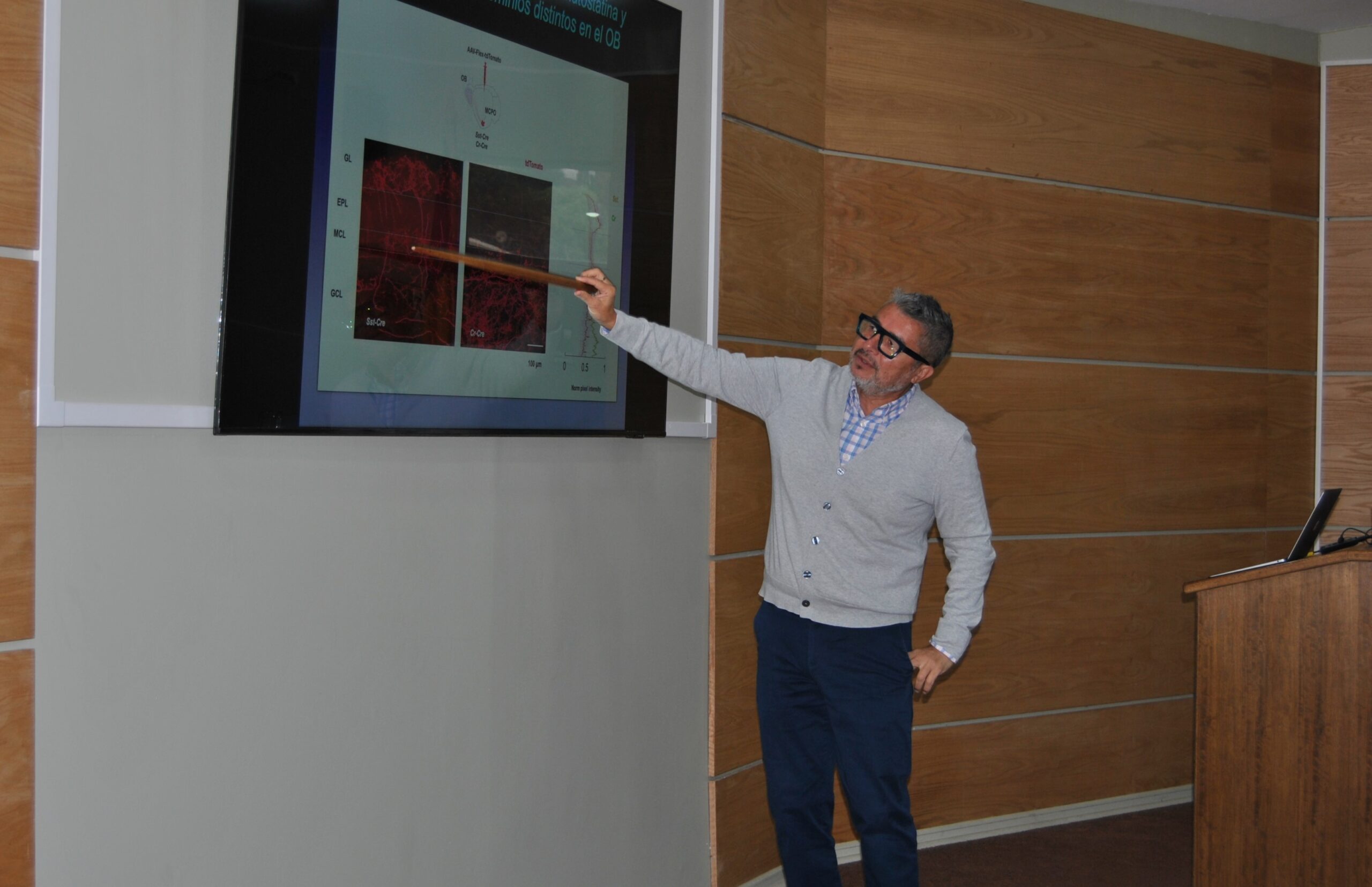 La charla «Inhibición en el sistema olfatorio” fue organizada por la Dirección de Investigación de la FCB en el marco de un proyecto Fondecyt dirigido por la profesora María de los Ángeles García, y donde el doctor Araneda es colaborador.