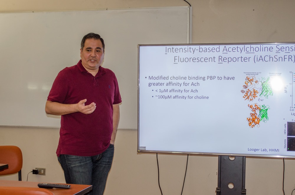 Dr. Armando Salinas, del NIAAA del George Mason University, exponiendo sobre «Use of genetically encoded biosensors for dopamine (DLight) and acetylcholine (IACHSNFR) release in awake, freely-behaving mice».