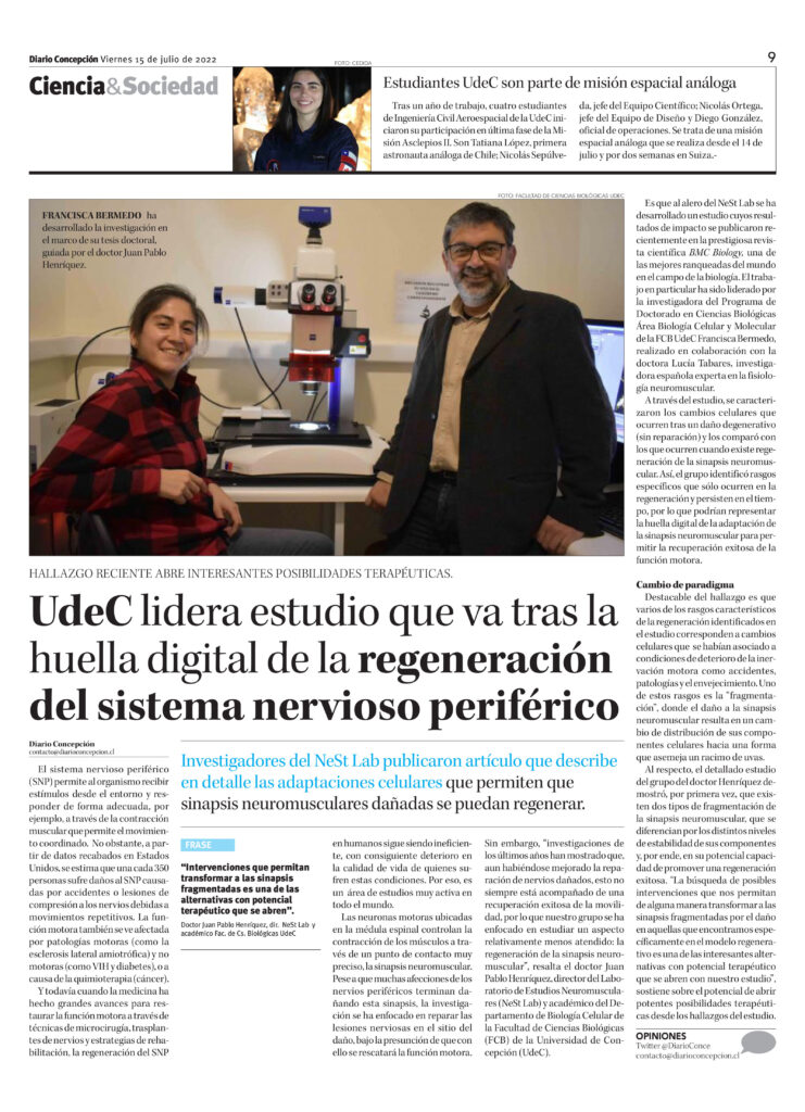 Investigadores del NeSt Lab publicaron artículo que describe en detalle las adaptaciones celulares que permiten que sinapsis neuromusculares dañadas se puedan regenerar con éxito, lo que abre interesantes posibilidades terapéuticas. Conoce más de esta noticia en Diario Concepción: https://www.diarioconcepcion.cl/ciencia-y-sociedad/2022/07/15/udec-lidera-estudio-que-va-tras-la-huella-digital-de-la-regeneracion-del-sistema-nervioso-periferico.html